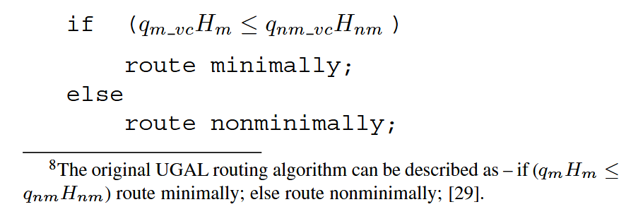 UGAL은 패킷 단위로 MIN과 VAL 중 한 경로를 네트워크이 load-balance를 고려하여 선택한다. Queue length와 hop count를 통해 network-delay를 예측하여 더 적은 delay를 가지는 경로를 선택한다.