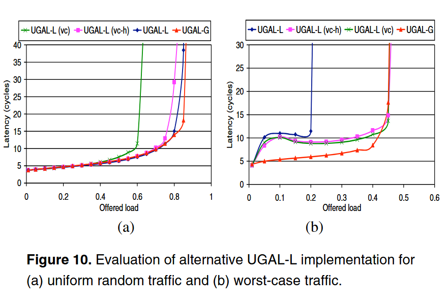 시뮬레이션 결과 worst-case traffic 패턴에서는 UGAL-G 수준의 throughput (이상적인 성능)을 확보했지만 UR traffic에선 throughput이 30% 정도 감소했다. 이유는 WC 상황에서는 대부분의 트래픽이 non-minimal로 가야 하기 때문에 분리된 VC가 효과를 내지만, UR 상황에서는 대부분 minimal 경로가 최선이라 VC 분리가 혼잡을 제대로 반영하지 못한다고 볼 수 있다.