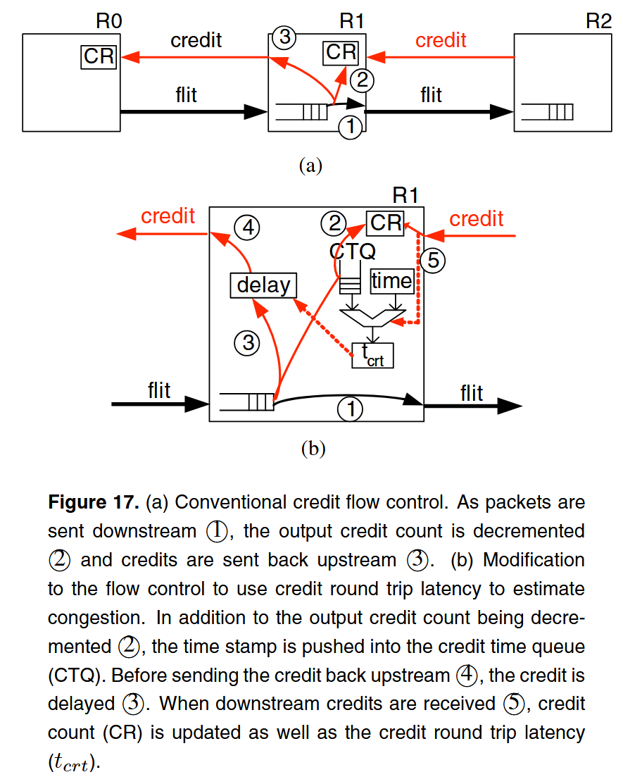 Credit Timestamp Queue (CTQ)를 사용하여 credit round-trip latency를 쉽게 구할 수 있다. Figure 17에 다이어그램이 있는데, flit 전송 시 현재 시간을 timestamp로 찍고 CTQ tail에 push 한다. 해당 credit이 돌아오면 CTQ head에서 pop한다. push와 pop 시점의 차이가 그 credit의 round-trip latency가 된다.