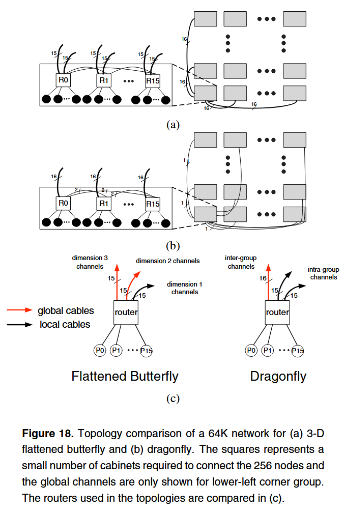 네트워크 비용은 주로 채널(특히 글로벌 채널)에서 발생한다. Flattened Butterfly 토폴로지에선 중간 라우터와 채널을 제거해서 기존 folded-Clos 토폴로지에 비해 50%에 가까운 비용을 절감했다. Dragonfly에선 flattened butterfly의 아이디어를 확장해서 effective radix를 증가시키는 방향을 채택했고 더욱 효과적인 비용 절감과 확장성을 가지게 되었다.