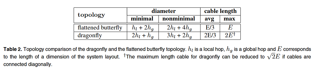 64k node를 기준으로 두 토폴로지를 비교했다. Dragonfly는 그룹 크기가 16 라우터(256 터미널), flattened butterfly는 각 차원 크기를 16으로 설정했다. 64k node를 가지기 위해서는, flattened butterfly는 16 크기를 가지는 두 개의 추가 차원이 필요하다. Dragonfly에선 256 radix virtual router로 모든 그룹을 단일 글로벌 차원에서 연결하는 게 가능하다. 두 토폴로지 모두 global bisection bandwidth는 동일하지만 dragonfly는 절반 정도의 global cable만으로도 충분하다. Flattened butterfly는 50% 정도의 포트를 global 연결에 사용하지만 dragonfly는 25% 정도만 사용한다. 게다가 dragonfly는 그룹 크기를 키워서 확장성을 가져갈 수 있지만 flattened butterfly는 추가 차원이 필요하다. Table 2를 보면 홉 수는 거의 같다. 하지만 dragonfly는 글로벌 케이블 길이가 더 길어질 수록 필요한 케이블 수 자체가 줄어들기 때문에 장거리에서 효율적인 광통신 기술과 잘 맞아떨어지게 된다.