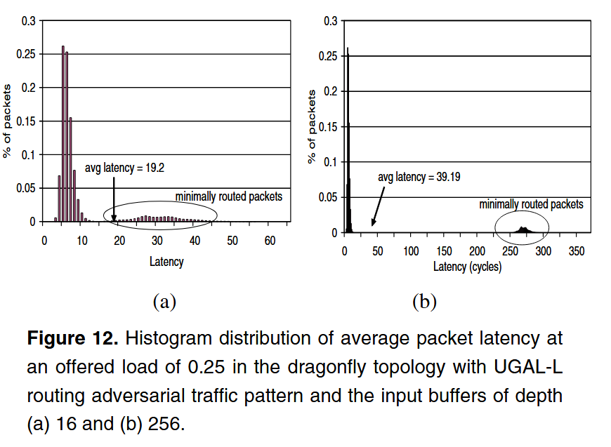 UGAL-L의 높은 중간 latency는 최소 경로로 라우팅된 패킷들이 출발지와 혼잡 지접 사이 채널 버퍼를 혼잡이 감지되기도 전에 채워버리기 때문이다. Figure 11을 보면 min, non-min 경로로 라우팅된 패킷의 latency가 얼마나 걸리는지 나와있다. non-minimal 경로의 latency는 UGAL-G에 가깝지만 minimal 경로에서는 중간 정도의 부하에서 큰 latency를 보이는 것과, input buffer가 커지자 latency가 급격히 커진 것을 볼 수 있다.